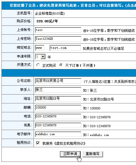 注意:如果您的会员号里有足够的款,开通方式可以选择"正式购买",这样,空间可以马上开空,并且马上投入使用。(如果域名未生效的,可以通过本站免费绑定的三级域名进行访问)