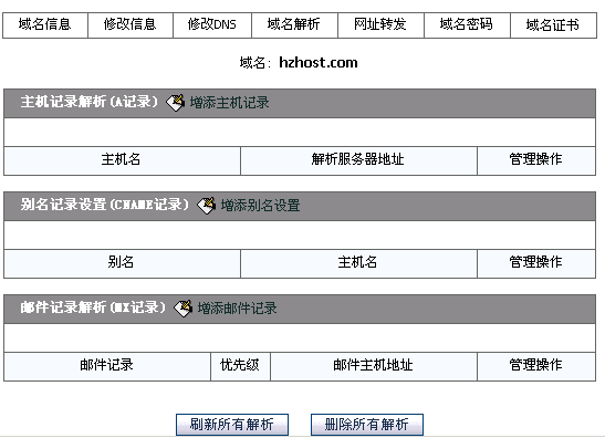 1>首先请进入域名管理。(登录会员->英文域名管理->在列表中找到hzhost.com并点击"域名解析"),对于新申请的域名,您将看到以下图例: