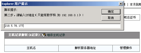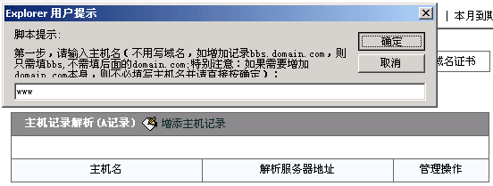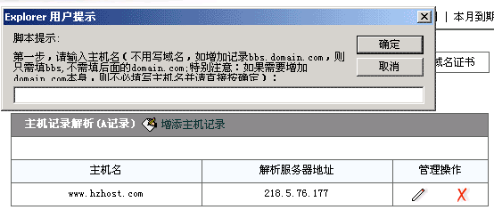 2>我们首先来解析www.hzhost.com到IP:218.5.76.177。 点击"增添主机记录",然后在弹出的框内输入"www",注意,不能输入"www.hzhost.com"。如下图所示: