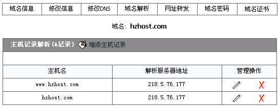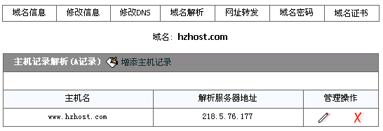 现以域名hzhost.com为例,把域名www.hzhost.com以及hzhost.com解析到虚拟主机上(假设虚拟主机的IP地址为218.5.76.177),解析完成后,您将可以用www.hzhost.com以及hzhost.com来访问您的网站,当然(解析完成后,还得在虚拟主机上绑定才会生效,本站的虚拟主机完全具备域名自主绑定功能)。