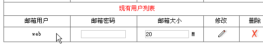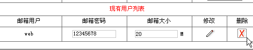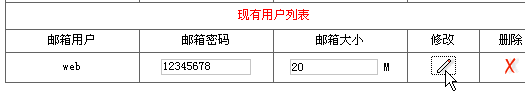 1> 进入企业邮局管理界面:2> 在"邮局用户管理"页面,在需要修改的邮箱对应输入项中输入新的邮箱密码或者邮箱大小,点击修改按钮即可进行修改。3> 在"邮局用户管理"页面,在需要删除的邮箱后面点击删除按钮即可删除。