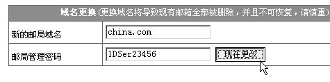 这是本公司自主开发的虚拟主机管理系统的重要优势之一,您完全可以自主更换邮局域名。1> 进入企业邮局管理界面:2> 在"邮局域名更换"页面,输入新的域名和管理密码。 3> 单击"确定"即可。注意:更换域名后,旧的邮箱都将不复存在而且不可恢复,请慎重。