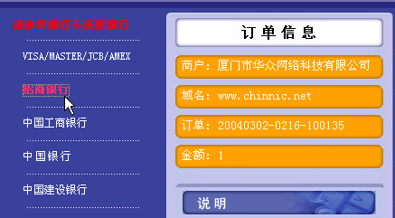 3、如果您传真或者扫描都不方便,那么请您在汇款的时候多汇款一个尾数,比如需要汇款1680元,那么请汇款例如1680.2元。汇款之后,请直接发送email至:caiwu@chinnic.net,信中请详细注明以下信息: 您的会员帐号 您汇款的准确金额 您汇款采用的银行 汇款到我公司哪个银行帐号 汇款时间 您需要购买的产品 您的联系方式